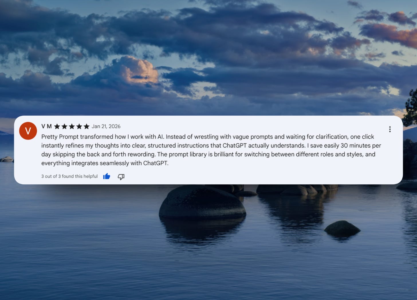 âPretty Prompt transformed how I work with AI. Instead of wrestling with vague prompts and waiting for clarification, one click instantly refines my thoughts into clear, structured instructions that ChatGPT actually understands.