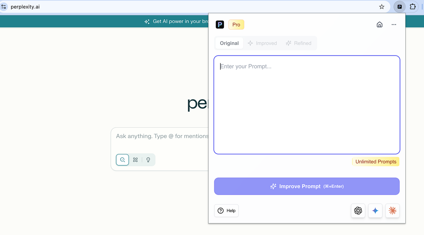 You can use Pretty Prompt in multiple ways. Through the web app, through the extension popup (like most other extensions), but the most common and powerful way is right inside, where you prompt: ChatGPT, Gemini, Claude, Perplexity, etc.