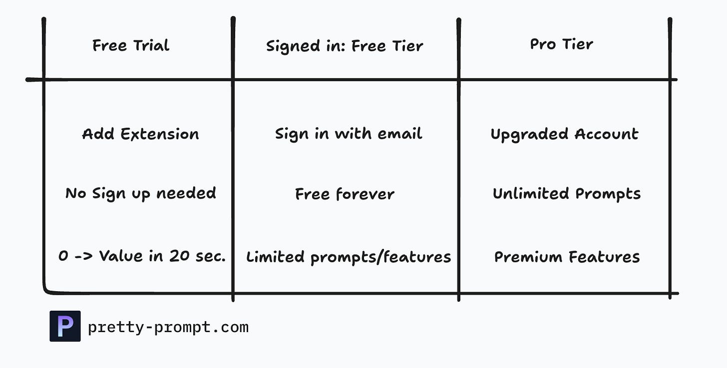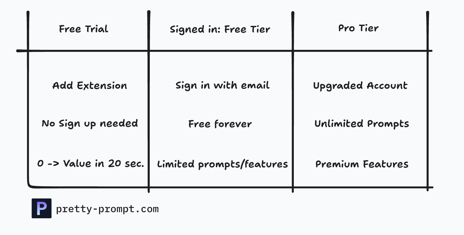 We call this a “free trial”. So you can use it for a couple of prompts, right out of the box. Only after you get value, you’re asked to sign in to continue using Pretty Prompt for free.
